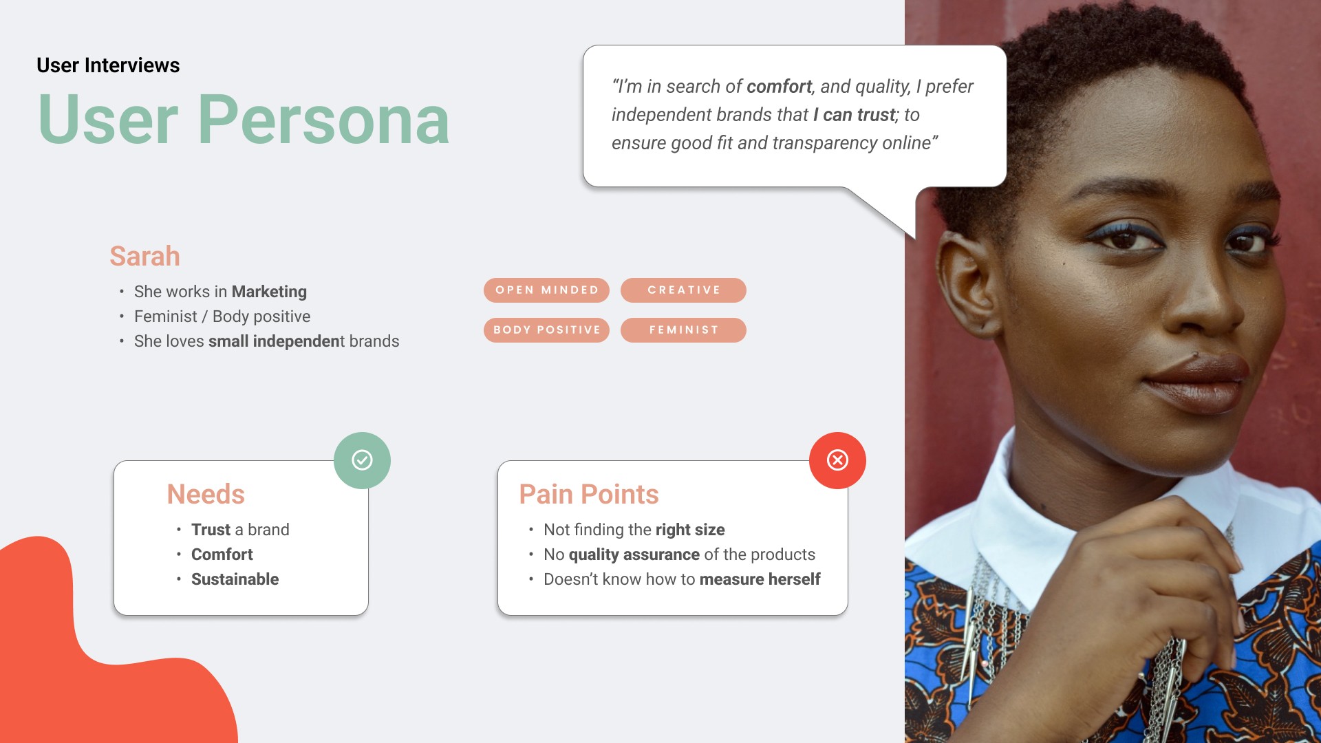 Mapped the user journey, highlighting pain points like sizing confusion and lack of transparent brand information.