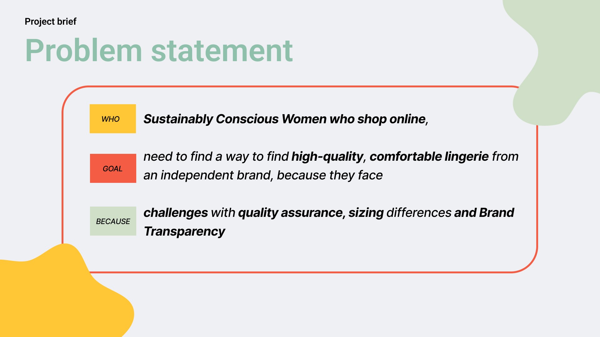 Sustainably conscious women who shop online need to find high-quality, comfortable lingerie from an independent brand. But they face challenges around quality assurance, inconsistent sizing, and lack of brand transparency.